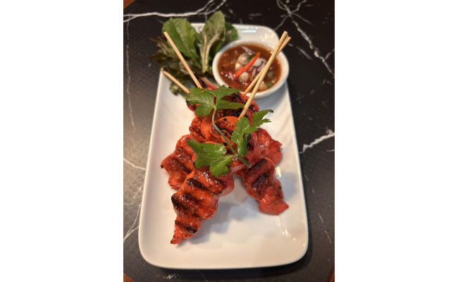 Marinaded pork grilled on wooden skewers. Served with sticky rice and sweet chili sauce.